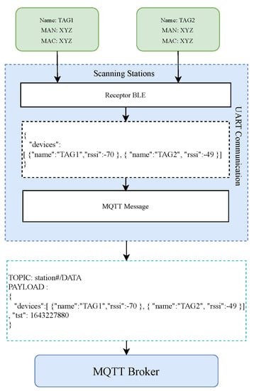 As shown in Figure 1, the TAG devices are connected to scanning stations via unidirectional communication, as the stations do not transmit information to the TAGs; however, multiple stations can (and ideally should) receive information from the same TAG. This MQTT communication layer has two fundamental components: the stations and the server.