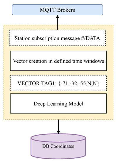 This layer is responsible for taking the RSSI information collected from the TAGs by the multiple stations, passing it to the neural network that has been previously trained in the same environment and under similar conditions, and generating the final result, which is a vector containing the coordinates (label) of the TAG with the corresponding time to be stored later in the database. The operation of the learning layer is depicted in Figure 3, and can be summarizes as follows: