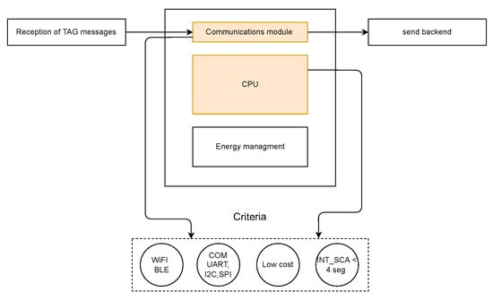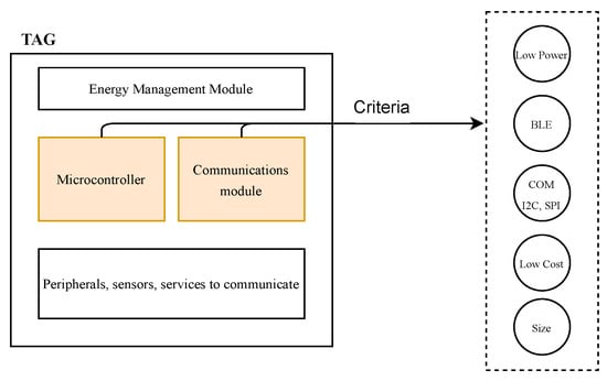 To develop the TAG device, a processing unit and communication stage are required, which are normally integrated in a single module. Figure 6 shows the different elements required for the TAG device, namely, low power consumption, BLE (Bluetooth Low Energy) communication, serial communication, low cost, and small size.