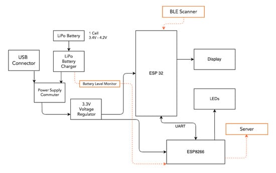 The scanning stations were powered through a 5 V DC supply; in the event they ran out of power, a LiPo battery (TR 18650, 6000 mAh–3.7 V) was used as a backup, allowing autonomous operation for approximately 6 h, for which a Power Supply Commuter block was needed. The voltage at the output of the commuter needed to be higher than 3.3 V plus the dropout of the regulator; additionally, both components (the commuter and the regulator) needed to be able withstand the power supply current of the circuit. The 3.3 V Voltage Regulator block powered the ESP32 and ESP8266 integrated circuits. The communication between the ESP32 and the ESP8266 was via UART, with the Display (OLED DISPLAY ) and LEDs (RGB) modules providing the mechanism for user feedback and showing the WiFi connection status of the station.