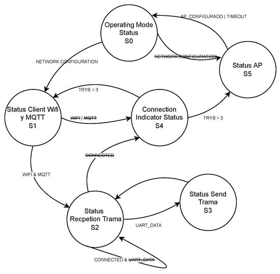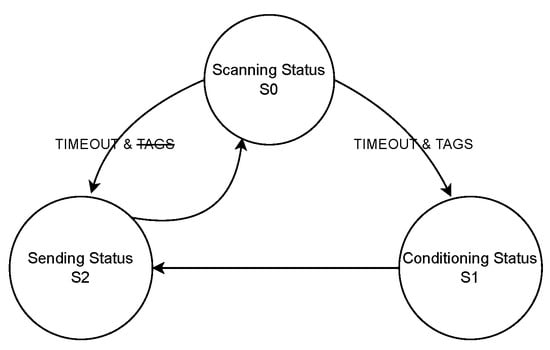 The main goal of this section is to present the development of the firmware architecture (scanning station and TAG) and to document the processes, codes, and information. As previously presented, the scanning stations are composed of two integrated circuits, an ESP32 and an ESP8266, with a common UART interface between them, while the TAG devices integrate an HM-10 module. The scanning station’s firmware was designed following a finite state machine (FSM) approach. Figure 7 shows the FSM diagram for the station’s BLE scanning phase running on the ESP32 module, including the different states and transitions. Figure 8 shows the FSM diagram of the ESP8266, the main function of which is to send the consolidated information from the BLE scanning phase (received via UART from the ESP32) to an MQTT server.
