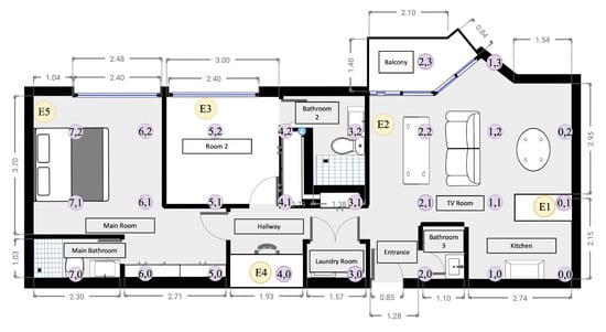 The place defined for the system tests corresponded to a two-bedroom apartment with an area of 80.46 m, a roof height of 2.57 m, and a perimeter of 47.8 m. Figure 9 shows the floor plan of the place in which the different tests were performed; the yellow circles represent the scanning stations and the purple circles are the predefined locations/labels. It should be noted that the arrangement of the stations did not vary either in the tests or during the execution of the system.