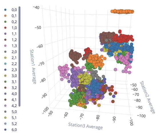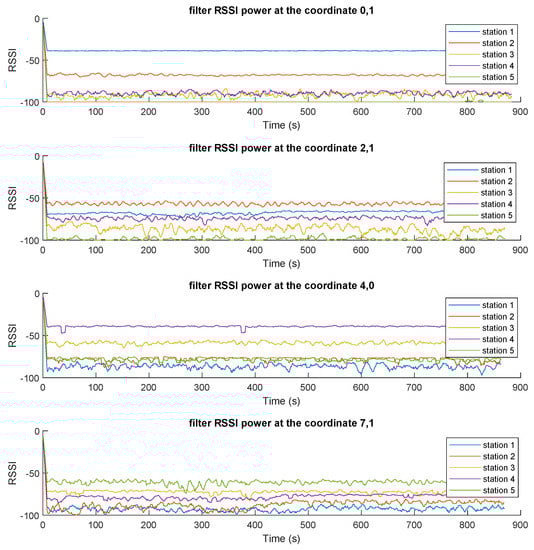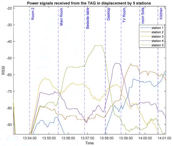 After the information was consolidated in the MQTT broker and the integration of the system is complete, different tests were performed to observe the dynamics of the received power of the messages coming from the TAGs. Figure 17 presents the received RSSI values for all five stations. The results exhibit several clear trends, with a number of important variations or noise levels that could later affect the performance of the classifier. Naturally, for a fixed position of the TAG, each station receives different RSSI values depending on the distance between the TAG and that station and any obstacles between them.