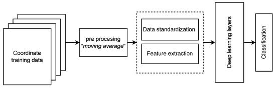 Figure 11 presents the main elements for the designed and implemented location estimation technique considering the coordinate training data, pre-processing, data standardization, feature extraction, model operation, and classification stages.