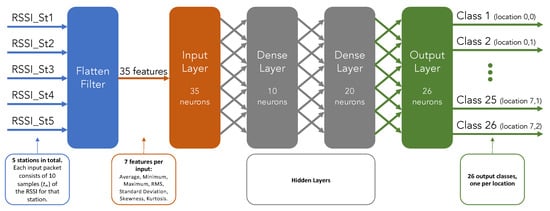 In order to identify the position of the different TAGs in a controlled space, a DL classification approach was selected supported by Edge Impulse [], an ML end-to-end web-based platform. As with any other supervised ML approach, the system must be trained for a specific environment or space of operation, and its operation is restricted to the same location. The general steps for this stage are as follows:
