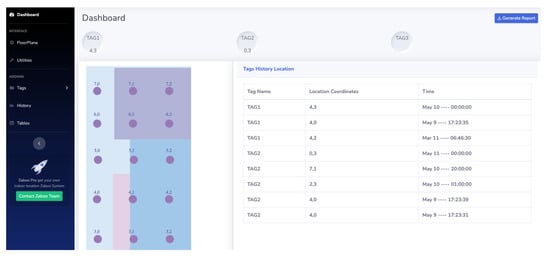 The fundamental idea of the web architecture layer is that the end user has the ability to access the location information of the available TAG devices. Therefore, the information coming from the DL module, which corresponds to the TAG coordinates and the time, is stored in the database. The backend oversees the direct communication with this database and the interaction with the user, and the different requests are managed in the frontend by means of HTTP calls. Therefore, in order to obtain different interactions in the future, such as voice assistants, chatbots, SMS, or APIs, different calls to the backend server can be made to find out the information of a specific TAG.