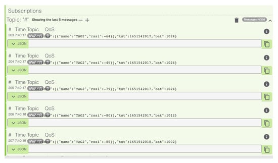 Finally, a centralization test is required to validate the proper transmission of the TAG information from each of the stations to the MQTT broker. The MQTTLens desktop application was used to observe the traffic messages from the broker, the different messages from the stations, and the corresponding scan times for each of the stations, as shown in Figure 16.