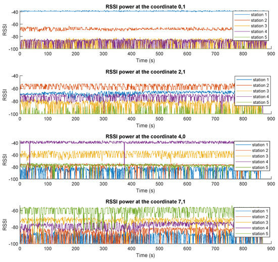 RSSI values received by all five scanning stations for four different locations (, , , and ).