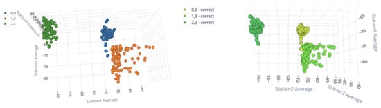 Figure 19 shows the features generated after the selected input processing block (Flatten) for a dataset consisting of only three locations (, , and ). As previously explained, this input block is useful for slow-moving averages such as temperature data, or in this case, tracking slow-moving objects. For this block, there is a classification accuracy of , as seen in Table 8, which is the best performance of the considered input processing blocks. In Figure 19, it is important to observe how one class differs from the others, as it is possible to plot hyper-planes after flattening the information on one of the axes; in other words, the classes are separable.