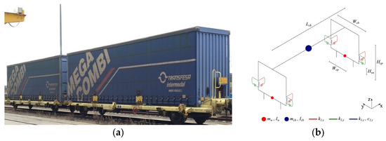 Laagrss type freight wagon: (a) double wagon overview; (b) numerical model.
