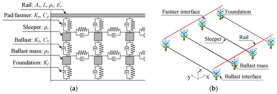 The track is modelled in ANSYS®, Canonsburg (PA), USA [51] with a multiple-layer scheme, in which the ballast, sleepers, and rails are linked through elastic elements that represent the mechanical behaviour of the interface, as shown in Figure 2. Figure 2a schematically presents the track, while Figure 2b represents the track model in finite elements. The ballast mass is simulated by discrete mass point elements, while the sleepers and rails are modelled with beam elements with appropriate properties. The interfaces, namely, the ballast and pads/fasteners, located below and above the sleepers, respectively, have been considered by using spring-dashpot elements in the three directions. Finally, spring-dashpot elements are used to consider the foundation’s flexibility. The properties of the track model, including the description of the variables presented in Figure 2, are presented in Table 2.
