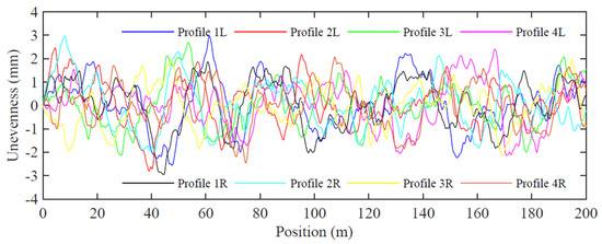 Four artificial irregularity track profiles are taken into consideration in this study. Based on accurate data, power spectral density (PSD) curves are generated and then artificial irregularity profiles in vertical and transverse directions are created in the MATLAB® software 2018a version [52]. Wavelengths between 1 m and 75 m with a sampling discretization of 0.01 m are considered, covering the wavelength ranges D1 (3 m to 25 m) and D2 (25 m to 70 m) defined by the European Standard EN 1384-2 [53]. The four different vertical irregularity profiles (1 to 4) created for both right and left rails are presented in Figure 3. The generated irregularity profiles show amplitude peak values between 5–6 mm, which are lower than those indicated in the European Standard [53].