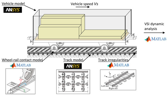 The numerical vehicle–track dynamic interaction simulations are carried out with the in-house software VSI—Vehicle-Structure Interaction Analysis validated and described in detail by Montenegro et al. [54] and used in distinct applications [34,55,56]. The key point of this model lies in the wheel–rail contact element connecting the two subsystems. This element governs the contact interface, more precisely the evaluation of the wheel–rail contact forces in the normal and tangential directions. After determining in each time step the position of the contact point, the algorithm computes the normal contact force through the Hertz nonlinear theory [57] and the lateral and longitudinal tangential creep forces through the USETAB routine [58]. This numerical tool is implemented in MATLAB® [52] and imports the structural matrices from both the vehicle and track previously modelled in a finite element (FE) package, which in this study is ANSYS® [51]. Note that, although the models of both subsystems are firstly modelled separately, the VSI software links them through a fully coupled methodology. The illustrative approach of the VSI tool is shown in Figure 4.