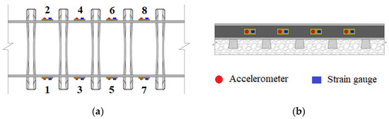The virtual wayside monitoring system is considered to detect trains with unbalanced loads above the limits. The system is composed of a set of 8 accelerometers and 8 strain gauges mounted on the rail at mid-span between two sleepers, as illustrated in Figure 5. The numbers 1 to 8 in the figure represent the positions of the measurement points, in the right and left rails. In order to have a more realistic track response, an artificial noise of 5% is considered in the numerical measurements. To obtain a closer and more reliable reproduction of the dynamic response and to the sampling frequency of real sensors, a sampling frequency equal to 10 kHz is used.
