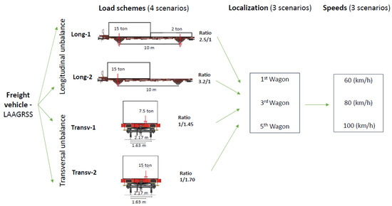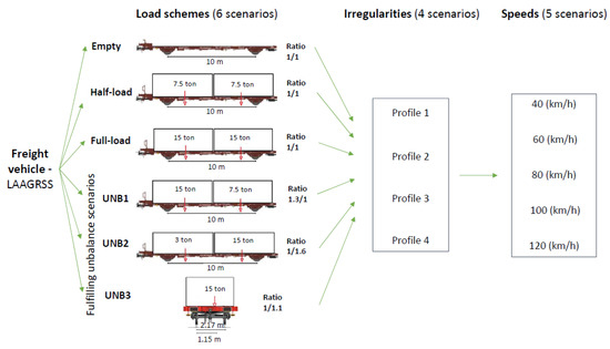 In order to define a robust baseline with a broad range of scenarios for detecting situations of instabilities, several simulations are conducted with different configurations of loads, track irregularities, and vehicle speeds. Figure 6 summarizes the assumptions for baseline scenarios, using six load schemes, four irregularity track profiles (1–4), and five different speeds (40 to 120 km/h in intervals of 20 km/h). A total of 113 simulations are performed with the Laagrss-type freight train composed of five wagons. The considered loading scenarios are empty, half-load, and full load plus three other loading schemes (UNB1, UNB2, and UNB3) with unbalanced loads under the limits prescribed by UIC code of practice [51]. The load schemes UNB1 and UNB2 have unbalanced loads in the longitudinal direction and UNB3 in the transverse direction. The full load scheme presented in Figure 6 corresponds to an even load distribution on the wagon with two containers with 15 t each, without exceeding the maximum mass per axle.