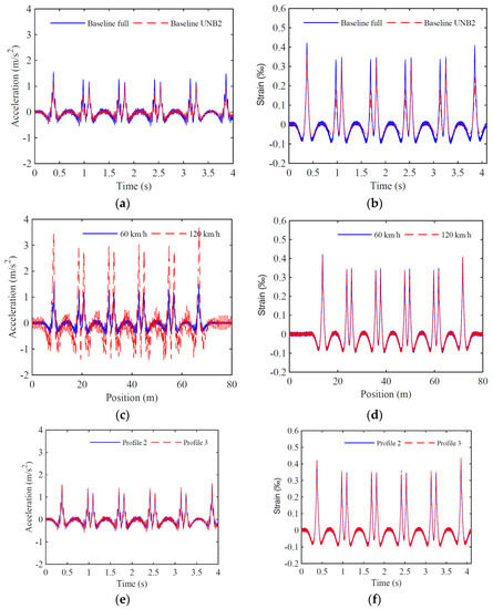 Time-series with accelerations (a,c,e) and strains (b,d,f) measured in position 1 for baseline scenarios: (a,b) comparison between full and UNB2 load schemes; (c,d) comparison between 60 and 120 km/h; (e,f) comparison between irregularities profile 2 and 3.