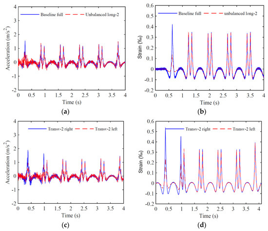Moreover, some results are shown for unbalanced scenarios at measured position 1. Figure 9a,b compare even full load distribution with longitudinal unbalanced scenario 2, while Figure 9c,d show left and right rail responses considering a transverse unbalanced load scheme. The results show a difference in terms of peak acceleration and strain values during the first wagon passage, where the unbalanced load exists. In the case of the transverse unbalanced load, the acceleration and strain peak values are higher for the right rail than the left rail, a consequence of the load asymmetry. In general, the strain responses are clearer than the acceleration responses, and visually, the unbalance is more distinguishable.