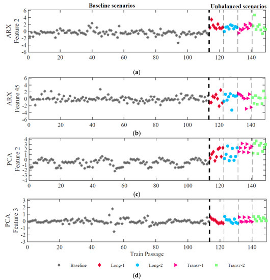 In Figure 11a,d, the features present a greater dispersion in baseline and unbalanced scenarios, which is indicative of the influence of the effects of operational variations considered in the simulated scenarios, and the difference of amplitude for baseline and unbalanced passages is almost imperceptible. In turn, Figure 11b,c show, for feature 45 of ARX and feature 2 of PCA, that the amplitude variation of the unbalanced scenarios is greater than the baseline scenarios. This proves that only specific features have the potential to identify unbalanced loads. Particularly for PCA, feature 2, related to the standard deviation, shows sensitivity to distinguish between longitudinal and transverse unbalanced loads.