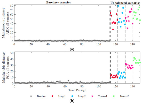 Mahalanobis distance (MD) is used to reduce multivariate data into one single DI [60]. The MD calculates the distance between the unbalanced and baseline scenarios to define similarities between them, where short distances represent large similarities. The MD is generic enough to be used to detect any unbalanced scenario, while providing a weighting that is entirely unsupervised, and therefore independent of human intervention, type of train, etc. It consists of a weighted DI in which the weights are determined by the covariance structure. In addition, and more importantly, the weighting proportional to the covariance structure provides an additional layer of feature normalization which allows outlining with high sensitivity those that were not used for the definition of the covariance structure.