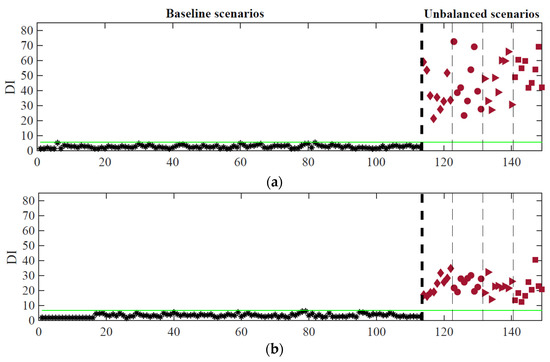 Figure 15 shows the effectiveness of the proposed methodology by comparing the CB (represented as a green line) with the different DIs of each one of the 36 train passages with unbalanced loads. Since the DIs for the first 113 passages are less than CB, the algorithm can successfully distinguish an evenly train loading from an unbalanced one. As proved by the different plots of Figure 15, unbalanced load detection is successfully achieved, with no false-positive or false-negative cases, by using 8 accelerometers (Figure 15a), 8 strain gauges (Figure 15b), or by using 8 accelerometers together with 8 strain gauges (Figure 15c).