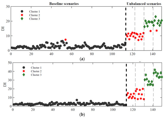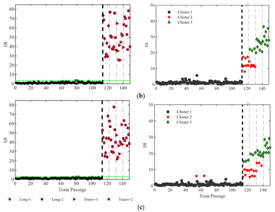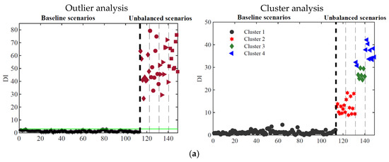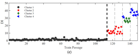 In Figure 17a, the results using a 16-sensor configuration, with 8 accelerometers and 8 strain gauges, which is the configuration used in the results shown in previous sections, are presented. Then, in Figure 17b,c, a reduced number of sensors are considered respectively for an 8-sensor configuration (4 accelerometers and 4 strain gauges) and a 4-sensor configuration (4 accelerometers and 4 strain gauges). In terms of outlier analysis, the DI amplitude decreases with the reduction of the number of sensors. However, in all sensor configurations the methodology shows to be very efficient in detection. Regarding the cluster analysis, the well-defined three clusters obtained with 16 sensors start to diffuse into two distinct clusters in the case of 8 sensors, losing efficiency for the 4 sensors configuration.