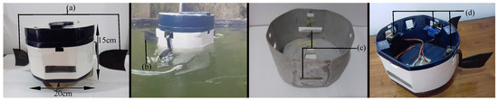 Research on social robots incorporates a minimalistic approach when designing the exterior to obtain optimum human–robot interaction [37]. The most common approach to creating robotic fish typically uses a slim body shape with a multi-jointed body structure [3]. The body displacement of fish categorizes fish into five main categories: Anguilliform, Subcarangiform, Carangiforrm, Thunniform, and Ostraciiform [13]. Our approach is to develop a model that imitates the Ostraciiform motion; thus, unlike the other methods involving carangiform and sub-carangiform locomotion, the robotic fish generates thrusts using only its caudal fin [38,39]. In designing the robotic body, the space and strength required to mount the hardware devices must be considered, resulting in a round-shaped rigid body design with an oscillating tail that is 20 cm long and 15 cm tall. The approach of this study suggests a minimalistic design without affecting its dynamic model while encouraging interaction with humans. Figure 1 shows the implemented design of the robot that was built.