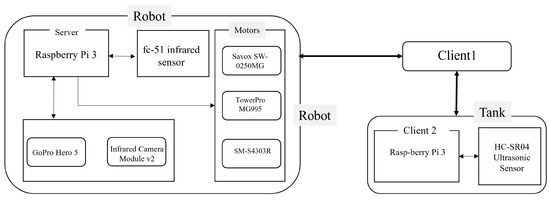 In this study, two Raspberry Pi Model B micro-controllers, each equipped with a 2.4 GHz 802.11n wireless network, were utilized. One Raspberry Pi (referred to as the “server”) was placed inside the robot’s rigid body and was responsible for controlling the servo motors, cameras, and sensors. The video frames captured by two cameras were transmitted to a computer (referred to as “client1”) and received the necessary control signals via web sockets. The second Raspberry Pi (referred to as “client2”) was installed outside of the aquatic environment and was equipped with a proximity sensor system to detect human presence. Figure 3 displays the schematic diagram of the hardware for the robotic system.