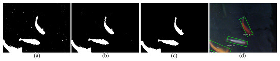 where and are the pixel position, t denotes the time, l denotes the photo label, and Th represents the threshold value. We combined BS and MA using the bitwise “And” operation and applied 15 times of image closing, 15 instances of image opening, 2 instances of image eroding, and 10 instances of image closing, respectively, for the noise cancellation. Furthermore, filters are used for both closing (with a kernel size of 2 × 2) and opening (with a kernel size of 1 × 1) operations, and then the center points of each moving fish were calculated. Figure 6 shows the sample output that is obtained from the fish detection.