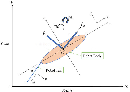 Suppose [X, Y, Z] denote the Cartesian coordinates, and [x, y, z] represent the body-fixed coordinates concerning to robotic fish. , , are unit vectors along x, y, z, respectively. Throughout this study, we assume the centroid and center of gravity coincide at point G and that the robotic fishtail only oscillates in the xy-plane. Further, we assume that the robotic fish’s rigid body is symmetric to the xz-plane. Moreover, denotes a unit vector parallel to the tail and denotes a unit vector perpendicular to the tail. The velocity at G and angular velocity can be expressed as, , , respectively. The tail defection angle with respect to negative x-axis denoted by and denotes angle between X-axis and x-axis. Using Kirchhoff’s equations of motion,