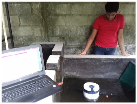 The authors of this study, one of whom is an enthusiast for Cyprinus carpio fish during his leisure activities, created an experimental setup in a home garden. An aquatic environment measuring 240 cm × 120 cm × 90 cm was constructed to detect patterns and develop algorithms. The tank was filled with fresh water and 10 Cyprinus carpio fish of different sizes were placed inside. Ultrasonic sensors were installed around the fish tank. The fish were introduced to the environment and the robotic fish was deployed. The fish were given time to adapt to the new environment and to start performing their natural swarm behaviors. Data collection for the fish-detecting algorithm was performed using the GoPro camera located at the bottom of the robot. Additionally, a web camera was set up on top of the tank to observe the behavior of the robot and the fish. Figure 4 illustrates the experimental setup used in this research.