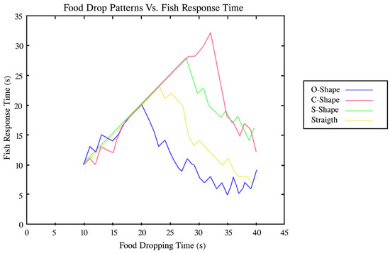 According to the results, the C-shape food pattern had a higher percentage (55.6%) with the fish Schooling-Parallel pattern (Pattern 2). In contrast, all patterns have similar percentages to the fish Schooling-Following pattern (pattern 1). Furthermore, the O-shape and Straight food patterns were 40.9% and 36.4%, percentages, respectively, with the Shoal pattern (pattern 3). Compared with the Fish Schooling Parallel pattern, the C-shape food pattern and O-shape food pattern were 35.3% and 47.1%, respectively. Fish response to particular fish-food drop patterns varied according to the time. Figure 13 shows fish responses for C-shape and O-shape patterns and that the fish lost their interest at 32 and 19 s, respectively. Table 6 contains the maximum time (in seconds) for each fish food pattern along with fish interest.