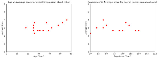 The animacy, design of the robotic fish, and overall satisfaction achieved better user feedback compared to the effectiveness of robotic behaviors, which have achieved moderate user feedback. Since all the questions from parts 2–5 are on the same Likert scale, the average value of the output was obtained in each of the sections. As shown in Figure 14, when the age increases, the overall impression of robotic fish is also increasing. As in Figure 14, it was also found that there was no significant relationship between the amount of experience and the average score for the overall impression of robotic fish. According to the data collected from participants as feedback, some of them suggested that their moods and stress levels were not the same throughout the experimental time. Some suggested that more fish drop patterns could generate different fish swarm patterns. Hence, additional fish drop patterns should be used to change the fish swarm behaviors.
