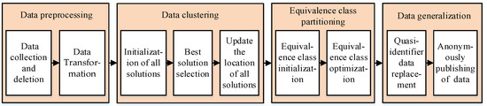 In terms of the t-closeness model, Wang et al. [27] propose a privacy-preserving algorithm for multiple sensitive attributes (PAMS). PAMS uses principal component analysis to reduce the multiple sensitive attributes to one-dimensional data space, sorts the new data in ascending order and partitions them into different groups. Then, PAMS selects data from each group to generate equivalence classes through the fuzzy c-means clustering method. This algorithm satisfies the t-closeness anonymous model, but it requires feature dimensionality reduction, resulting in a decline in the clustering quality of multi-dimensional data. Sei et al. [28] propose a privacy model containing an anonymization algorithm. In order to satisfy t-closeness, the algorithm changes the original records with a fixed probability and adds some completely random records. Therefore, the reconstructed records are significantly affected by these random records, and the utility of the data is reduced. Fathalizadeh et al. [29] generalize the sensitive data and use the shortest path algorithm to find k records with similar sensitive data to partition the equivalence classes, then can realize data anonymity by generalizing the quasi-identifier data. However, it causes a heavy cost resulting from the rearrangement of records that satisfy the equivalence class partitioning conditions after the creation of each cluster. Langari et al. [30] propose a combined anonymizing algorithm based on K-member fuzzy clustering and a firefly algorithm for anonymized database protection. This algorithm uses a modified K-member version of fuzzy c-means to create balanced clusters with at least K members in each cluster. Then, it uses the firefly algorithm to optimize the primary clusters and anonymize the network graph and data. Ganarde et al. [31] propose a novel anonymizing method based on multiple-graph-properties-based clustering. This method proposed a data normalization algorithm to preprocess and enhance the quality of raw data. Then, it divides the data into different clusters using multiple graph properties to satisfy the k-anonymization. However, the above literatures [27,28,29,30,31] usually cannot guarantee that the distribution of sensitive attributes of the equivalence class is skewed.