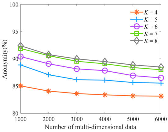 Next, we select the number of multi-dimensional data as 1000, 2000, 3000, 4000, 5000, and 6000, respectively. The number of clusters is respectively selected as 4, 5, 6, 7, and 8. Let the parameter t be 0.1, and other parameters are shown in Table 6. Then, we analyze the influence of cluster number K on anonymity. As shown in Figure 3, as the number of multi-dimensional data increases, the number of equivalence classes with similar sensitive data attributes increases. The attackers can successfully analyze the number of sensitive data of patients, so anonymity is slowly declining. As the number of clusters increases, the number of multi-dimensional data in each equivalence class starts to increase, and the proportion of sensitive attribute values and their parent node values in each equivalence class that is the same decreases. The attackers can successfully analyze that the number of patient-sensitive data decreases and the anonymity increases. However, as the number of clusters increases, the number of multi-dimensional data to be uniformly generalized increases gradually, leading to the increase of information loss rate. Therefore, anonymity and information loss rate should be comprehensively considered when selecting the number of clusters. When the number of clusters K is 7 and 8, there is little difference in anonymity. Considering that the increase in the number of clusters increases the information loss rate. Therefore, when the number of clusters K is 7, it can ensure that the algorithm has a high degree of anonymity, and the information loss rate tends to be the lowest.