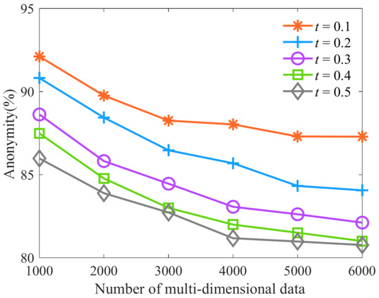 Then, we select the number of multi-dimensional data as 1000, 2000, 3000, 4000, 5000, and 6000, respectively. The constraint parameter t is respectively selected as 0.1, 0.2, 0.3, 0.4, and 0.5, and other parameters are shown in Table 6. Then, we analyze the influence of constraint parameter t on anonymity. As shown in Figure 4, more equivalence classes of similar sensitive data are generated with the increase in the number of multi-dimensional data. It leads to a smaller average diversity of sensitive data in equivalence classes and more equivalence classes with the same number of sensitive attribute values and their parent node value accounting for more than the threshold %. The attackers successfully analyze more sensitive data of patients. Therefore, the anonymity of KAPP decreases, but the decrease is limited. With the gradual increase of the constraint threshold parameter t, the distribution requirements of sensitive data for equivalence class partition are reduced, and the number of equivalence classes that do not meet the constraint is reduced. Sensitive data in the same equivalence class are similar, so it is challenging to show diversity. It leads attackers to analyze the number of sensitive data of patients successfully, so its anonymity decreases. When the parameter t is 0.4 and 0.5, in the process of equivalence class partition, fewer equivalence classes do not meet the constraint conditions and are merged. At this time, the parameter t has little influence on the equivalence class partition, and its anonymity has little difference. Therefore, when the parameter t is 0.1, the algorithm has a high degree of anonymity.
