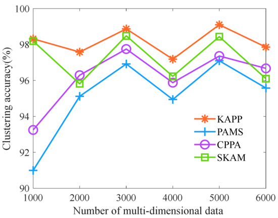 The number of multi-dimensional data is selected as 1000, 2000, 3000, 4000, 5000, and 6000, respectively. Let the parameter t be 0.1, the number of clusters is 7, and other parameters are shown in Table 6. Then, we analyze and compare the clustering accuracy, diversity, anonymity, and information loss rate of KAPP, CPPA, PAMS, and SKAM under the different numbers of multi-dimensional data. First, we analyze the clustering accuracy of algorithms with the different numbers of multi-dimensional data. As shown in Figure 5, with the increase in the number of multi-dimensional data, the clustering accuracy of PAMS, CPPA, and SKAM fluctuates wildly. In contrast, the clustering accuracy of KAPP fluctuates slightly and is significantly higher than other algorithms. The reason is that KAPP combines a multi-dimensional data clustering algorithm and generates the initial population through chaotic tent mapping. It can search for a better initial cluster center position before each clustering and combine the fuzzy C-means clustering algorithm and African vultures optimization algorithm. It can also accurately search the optimal global solution by improving the fitness calculation method and the current solution update strategy to achieve clustering according to the multi-dimensional data of sensitive data, which is more suitable for multi-dimensional data clustering. However, the clustering effect of other algorithms depends on the random selection of the initial clustering center. They tend to fall into the optimal local solution, and the clustering effect could be better. Therefore, KAPP’s clustering accuracy fluctuates less and is always higher than other algorithms.