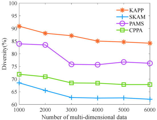 We further analyze the algorithm diversity with different numbers of multi-dimensional data. As shown in Figure 6, with the increase in the number of multi-dimensional data, the diversity of KAPP, PAMS, CPPA, and SKAM shows a downward trend. Note that the diversity of KAPP is significantly higher than that of PAMS, CPPA, and SKAM. The reason is that KAPP completes the clustering of multi-dimensional data and initialization of equivalence classes based on sensitive data and merges equivalence classes that do not meet the distribution conditions. It makes the distribution of sensitive data in equivalence classes become more evenly, and each equivalence class’s multi-dimensional data increase in the sensitive data distance. However, other algorithms only consider quasi-identifier data rather than sensitive data. It will make the sensitive data of the same equivalence class more similar, and the sensitive data distance between multi-dimensional data is smaller. Therefore, the diversity of KAPP is always superior to other algorithms.
