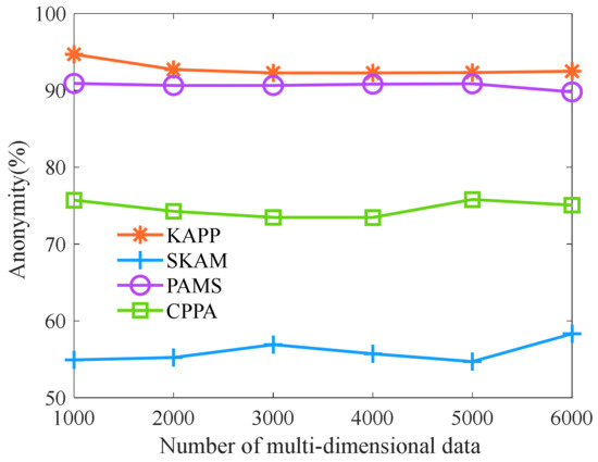 Then, we analyze the anonymity of algorithms with different numbers of multi-dimensional data. As shown in Figure 7, as the number of multi-dimensional data increases, the anonymity of KAPP, PAMS, CPPA, and SKAM remains unchanged. However, the anonymity of KAPP is higher than that of other algorithms. The reason is that KAPP uses a multi-dimensional data clustering algorithm based on improved African vultures optimization to cluster multi-dimensional data with high accuracy. Then, it partitions the equivalence classes according to the quasi-identifier data and merges the equivalence classes that do not meet the constraint conditions. It makes the sensitive data of the same equivalence class different and does not belong to the same category. Attackers successfully analyze less patient-sensitive data. However, the clustering effect of other algorithms is not ideal. In addition, they only consider that sensitive data of the same equivalence class is different and do not consider that sensitive data of the same class also cause privacy disclosure. Therefore, the anonymity of KAPP is significantly higher than that of other algorithms under skewness and similarity attacks.
