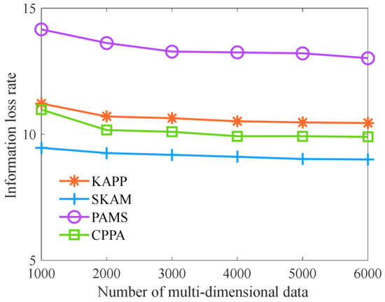 Finally, we analyze the information loss rate of each algorithm with the different numbers of multi-dimensional data. As shown in Figure 8, with the increase in the number of multi-dimensional data, the information loss rate of KAPP, PAMS, CPPA, and SKAM shows a downward trend. Moreover, the information loss rate of KAPP is lower than that of PAMS and slightly higher than that of CPPA and SKAM. The reason is that with the increase in the number of multi-dimensional data, the number of multi-dimensional data similar to quasi-identifier data increases, and each equivalence class can find more similar multi-dimensional data, so the information loss rate appears to be declining. At the same time, in optimizing the privacy protection model, KAPP considers that similar sensitive data in the same equivalence class are vulnerable to attacks and clusters multi-dimensional data with similar sensitive data. Then, it selects the most similar multi-dimensional data of quasi-identifier data from each cluster to form an equivalence class and optimizes the equivalence class that does not meet the constraint conditions. Therefore, KAPP increases the process of protecting sensitive data and has higher requirements for classifying multi-dimensional data equivalence classes. Its information loss rate slightly increases. However, CPPA and SKAM are not considered the distance of sensitive data in the process of equivalence classification and only partition the equivalence class for quasi-identifier data, so their information loss rates are slightly lower than KAPP. PAMS partitions equivalence classes through traditional clustering, and the clustering effect is not ideal, so its information loss rate is the highest. However, the information loss rate of KAPP is similar to that of PAMS and CPPA. Although KAPP has sacrificed some information loss, it has dramatically improved its diversity and anonymity.