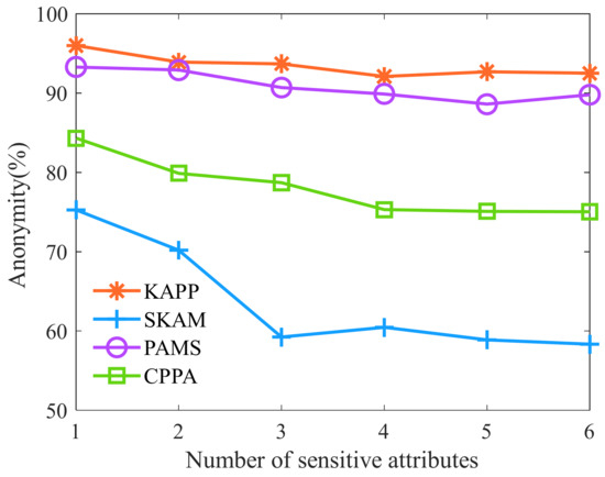 Then, we analyze the anonymity of the aforementioned algorithms with the different numbers of sensitive attributes. As shown in Figure 10, as the number of sensitive attributes increases, the anonymity of KAPP, PAMS, CPPA, and SKAM shows a downward trend. Moreover, KAPP’s diversity is significantly higher than that of other algorithms. The reason is that KAPP improves the AVOA and merges equivalence classes with small diversity. The diversity of KAPP with different numbers of sensitive attributes is always higher than that of other algorithms. The greater the diversity is, the smaller the number of patients’ sensitive data that can be successfully analyzed by attackers. Therefore, it can be concluded that the anonymity of KAPP is superior to other algorithms.