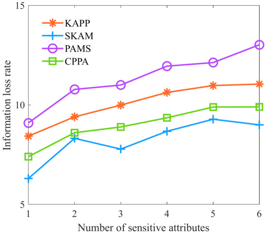 Finally, we analyze the algorithms’ information loss rate with different numbers of sensitive attributes. As shown in Figure 11, with the increase in the number of sensitive attributes, the information loss rates of KAPP, PAMS, CPPA, and SKAM all show an upward trend. The reason is that with the increasing number of sensitive attributes, it will be difficult to ensure the diversity of each equivalence class’s multi-dimensional sensitive data. Many equivalence classes do not satisfy the partition conditions, and KAPP needs to merge more equivalence classes. It leads to an increased information loss rate after the generalization of each equivalence class. Other algorithms must constantly adjust the equivalence class, and the algorithm diversity is guaranteed by sacrificing the information loss rate, resulting in a larger rate of information loss over time.