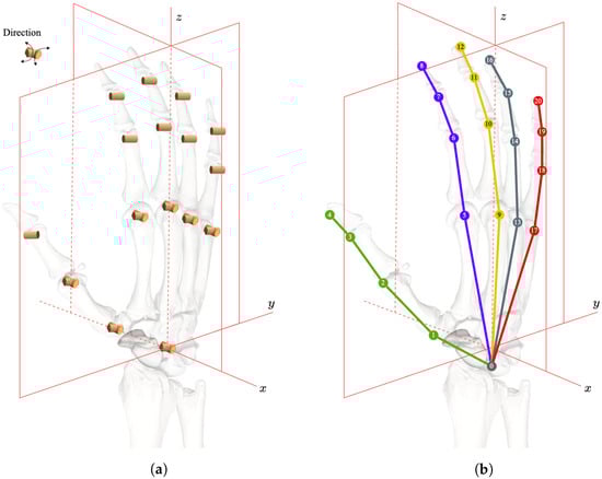 Biological characteristics of the human hand skeleton: (a) Illustration of the DoF of the hand; (b) Indices of the hand joints.