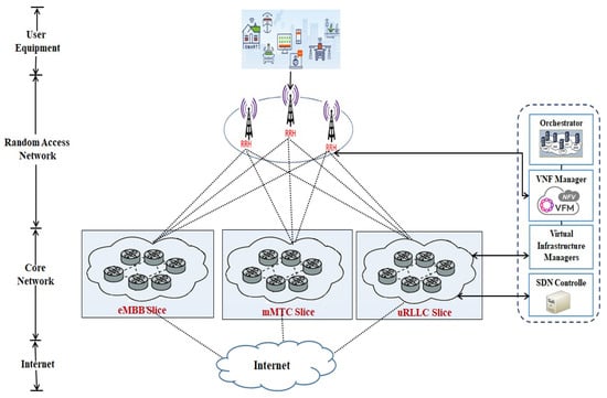 In recent years, private and commercial 5G mobile networks have faced enormous mobile traffic due to a growth in the use of portable devices by consumers. In the near future, 5G technology is projected to assist many new enterprises and vertical sectors, including transportation, healthcare, and the energy supply chain. A highly sophisticated 5G architecture [] is required for providing high-level, continuous, and reliable service to user equipment (UE) with a broad variety of needs. The next generation mobile networks (NGMN) by Alliance established the network slicing idea to achieve resource allocation for user devices with varying performance needs in 5G network settings []. Individual slices of physical infrastructure are created based on the grouping of requirements through a set of virtual network functions (VNFs) that have virtual resources, logical topology, traffic regulation, and node and link provisioning rules, as well as security monitoring parameters to guarantee the quality of service (QoS) []. The 5G system architecture that supports network slicing was previously established in the first edition of 5G normative standards and was authorized by the 3rd Generation Partnership Project (3GPP) []. According to the physical architecture, each logical network slice is generally made up of three key components: the radio access network (RAN) and the core network (CN) []. The logical networks are shown in Figure 1 with the components separated, assuming that the physical infrastructure is being used as a shared resource. RAN behavior was investigated in the work [] by taking into account the criteria associated with the quality of service in order to provide a dependable service to the UE. Nojima et al. [] dealt with network isolation in their study, and they allocated resources using traditional packet scheduling and dynamic resource block allocation techniques. In an orthogonal frequency division multiple access (OFDMA) context, network slicing and resource allocation based on a sub-carrier and power were performed in [], where the maximization of the network summation rate was treated as the objective function, with the traffic rate of each slice assumed. In [], network slices were found to be chains of virtual network functions and real resources to meet the varying needs of end users, leading a variety of studies on the issue of VNF deployment and orchestration.