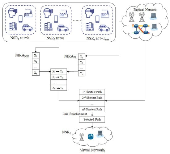 Each NSR was deployed on the physical network in two successive steps. First, the NSR’s nodes were allocated in accordance with the NIRA developed for both physical and logical networks. Second, the creation of links was carried out based on the SPA through SLE. Basically, the NIRA is a dynamic array that must be updated once each slice request is processed. Link mapping begins once nodes are allocated through the mapping of NIRAs for the physical and logical networks. SPA is created for link mapping using the SLE method, which employs Dijkstra’s algorithm [] to determine the shortest route between two nodes. Figure 2 illustrates the phases involved in the NSR deployment method.