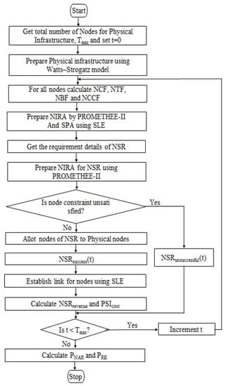 This operation allots a node and establishes a connection between the nodes of the NSRs that have been received during the time interval from 0 to . Throughout this study, it was assumed that all of the required NSR nodes belong to a single category, such as eMBB, mMTC, or URLLC. A NSR should be able to request any slice type at any point in time. The PROMETHEE-II method was used to allocate nodes for the NSRs, and the SLE algorithm, which is based on Dijkstra’s shortest route algorithm, was used to construct links between them. The hybrid PROMETHEE-II and SLE algorithms were used to obtain the best possible optimum provisioning for the NSR. In the physical infrastructure, the NIRA and SPA were updated in accordance with the lifetime of the received NSR, which allows for the identification of the most appropriate and optimum provisioning for the next arrival of NSR. As a result, the dynamic allocation of NSRs in the physical infrastructure was made effective and efficient. The success rate and resource efficiency of slice provisioning are two major indicators that are used to evaluate the efficacy of slice provisioning. This is accomplished by Algorithm 3 for the proposed hybrid algorithm, which allocates resources for NSRs for the maximum amount of time . The flowchart in Figure 3 depicts the sequence of events that occur throughout the whole solution method.
