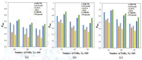 Resource efficiency under (a) 100, (b) 200, and (c) 300 nodes in physical infrastructure. Proposed method performance is compared with existing methods such as NSR-NR [], SA [], LAVA [], GLL [], VIKOR [].