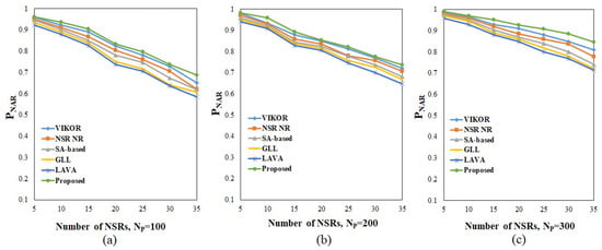Acceptance Ratio under (a) 100, (b) 200, and (c) 300 nodes in physical infrastructure. Proposed method performance is compared with existing methods such as NSR-NR [], SA [], LAVA [], GLL [], VIKOR [].