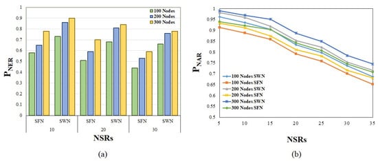 The construction of the SWN and SFN was carried out in this study by using the Watts–Strogatz model and the Barabsi–Albert model [], respectively. The comparison of the two networks has been carried out for many decades, and the findings show that the SWN has more benefits than the SFN since it can connect practically any two nodes in a network, but the SFN cannot. The purpose of this research was to determine the efficacy of the SWN for NSRs, since several studies have been conducted using an SFN for NSRs [,,,,]. The physical infrastructure based on the SFN and SWN is being built using the nodes 100, 200, and 300, which are currently available.