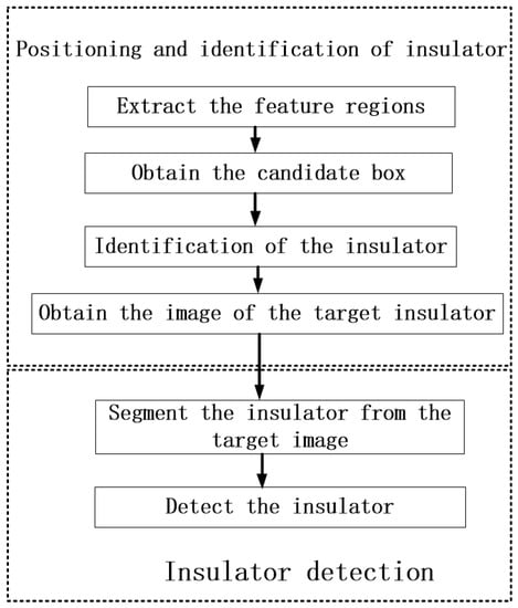 The missing insulator cap detection method proposed in this paper is divided into two steps. First, the insulator is located and identified in the transmission line detection image, and then the morphological method is used to determine whether there is a missing insulator cap. The specific steps of this method are shown in Figure 2.