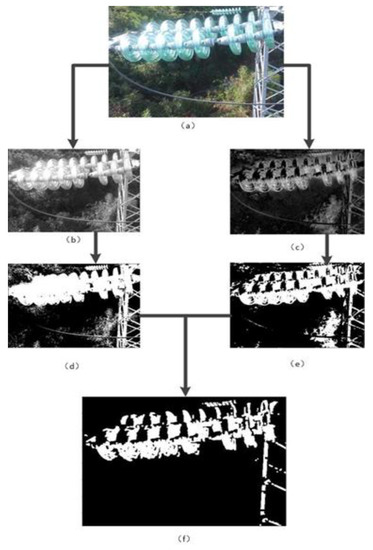 The acquisition of the characteristic area is shown in Figure 3. The proposed method is not suitable for high-resolution image processing. Therefore, the subsampled operation is carried out on the insulator inspection image to reduce the image resolution and obtain Figure 3a. Figure 3a is converted into the images shown in Figure 3b,c according to (1) and (2), respectively. Figure 3b,c are segmented using Otsu’s thresholding method to obtain their corresponding binary images, as shown in Figure 3d,e, respectively. The two binary images are subjected to an intersection logic operation, and the combined image is subjected to an open operation of the binary image to obtain a binary representation image of the characteristic image of the insulator, as shown in Figure 3f.